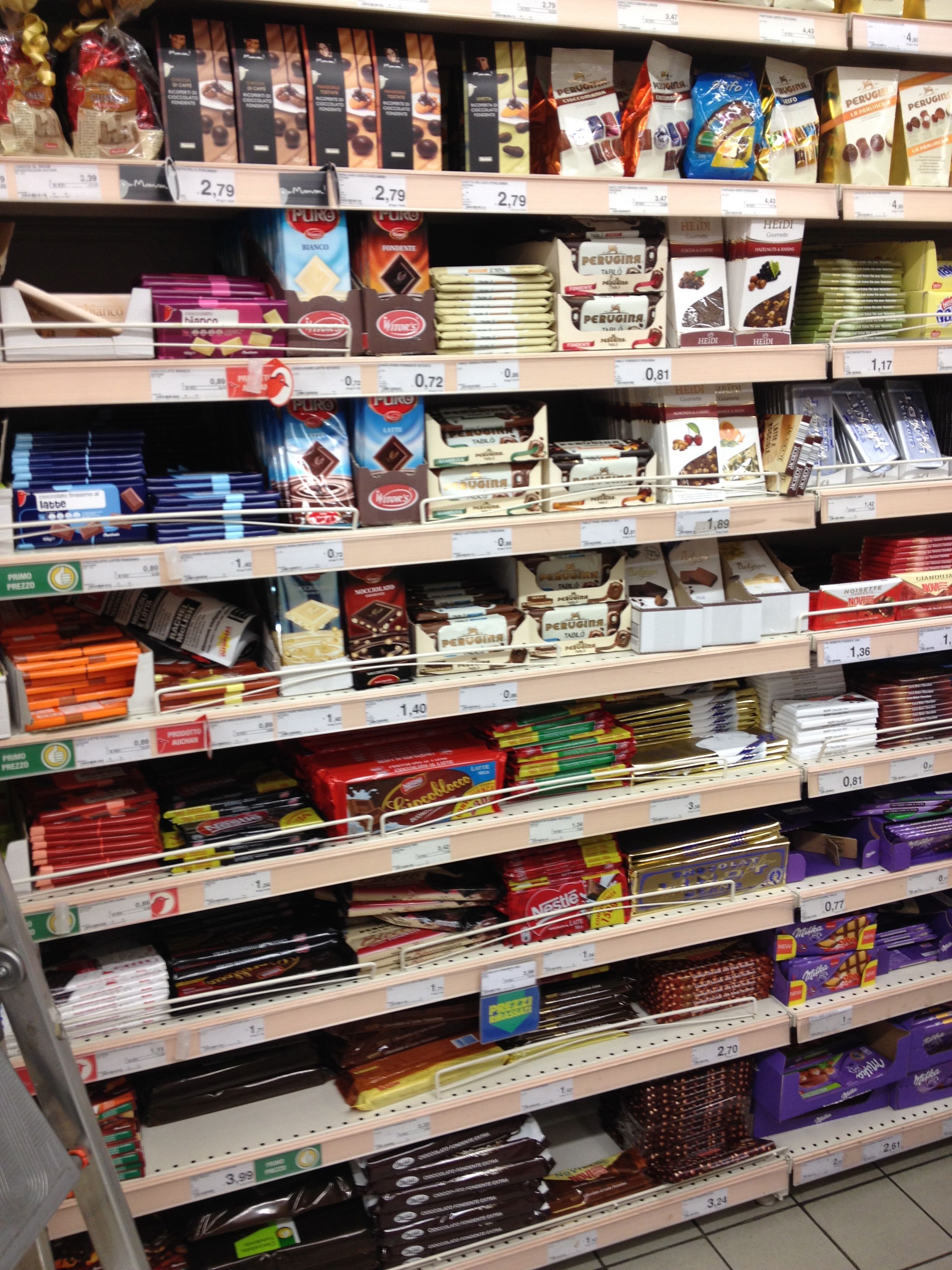 Come è stato precedente detto l’assortimento è molto ampio e profondo e la disposizione a scaffale mi sembra in base al prezzo (crescente da sinistra verso destra). Il primo prezzo è chiaramente indicato con i cartellini all’inizio della corsia cioccolata. Inoltre mi sembra che l’esposizione per prezzo sia incrociata con quella verticale, ossia marche premium in alto, leader ad altezza occhi e più in basso quelle economiche e confezioni maxi.