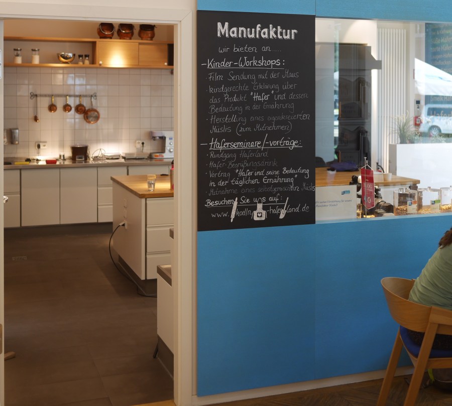 Naturalmente la soluzione per le aziende del food non può consistere nell’aprire semplicemente un negozio che presenti sugli scaffali le stesse scatole con i prodotti acquistabili presso qualsiasi altro distributore. Kölln Haferland è allora un muesli bar nel quale fare colazione, un laboratorio dove si organizzano periodicamente corsi e seminari sul mondo dei cereali rivolti ad adulti e bambini e un negozio esperienziale nel quale è possibile creare il proprio mix esclusivo di cereali, magari da regalare dopo aver realizzato e stampato anche una etichetta personalizzata.