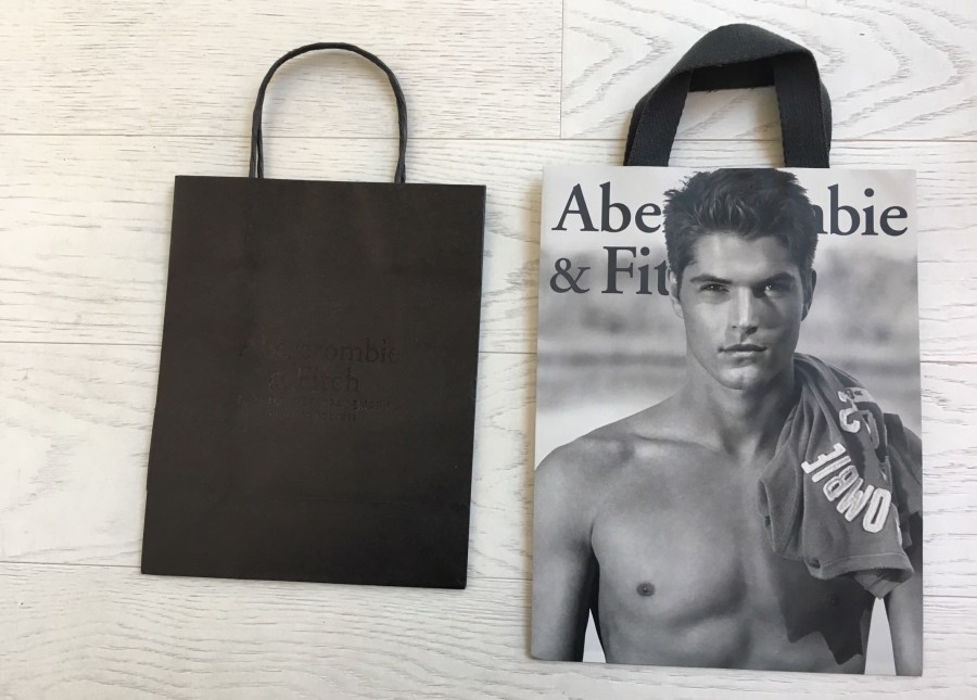 La maglietta che ho acquistato, senza nessun logo visibile e nessuna scritta che ricordi il brand, consegnata in cassa all’interno di un sobrio sacchetto nero con la scritta Abercrombie & Fitch tono su tono appena visibile (fotografato qui sotto a fianco di una vecchia shopping bag che avevo conservato) è un simbolo potente del nuovo corso di un’azienda che ha ormai abbandonato l’immagine legata a giovanotti sexy e poco vestiti che ne aveva caratterizzato il clamoroso successo in passato. Molto più sobria anche l’atmosfera del negozio dove c’è ora molta più luce e dove non si viene più storditi da musica e profumi invadenti.