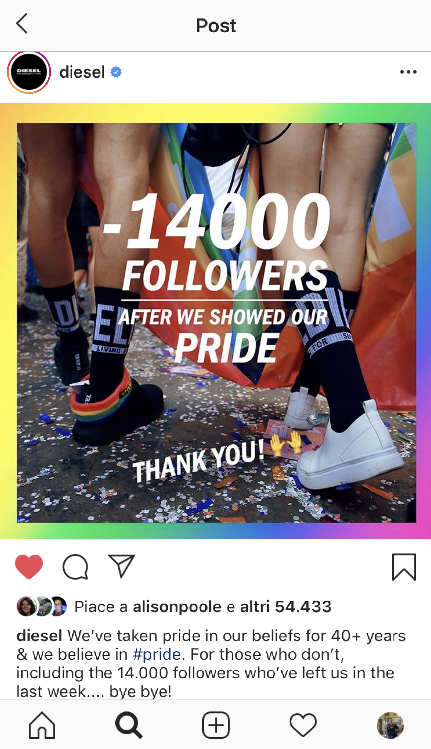 Il caso di Diesel può offrire uno spunto di riflessione interessante: l’azienda ha presentato una collezione di capi dedicati al Pride e ha pubblicato sul proprio account Instagram una serie di post sul tema caratterizzati dall’hashtag #loveislove. I post sono stati molto commentati e tra i commenti numerosi sono stati quelli di disapprovazione dell’iniziativa.  Il risultato di questa strategia di comunicazione è stato che in una settimana l’azienda ha perso circa 14.000 follower del suo account Instagram (che ne conta attualmente 2,1 milioni).