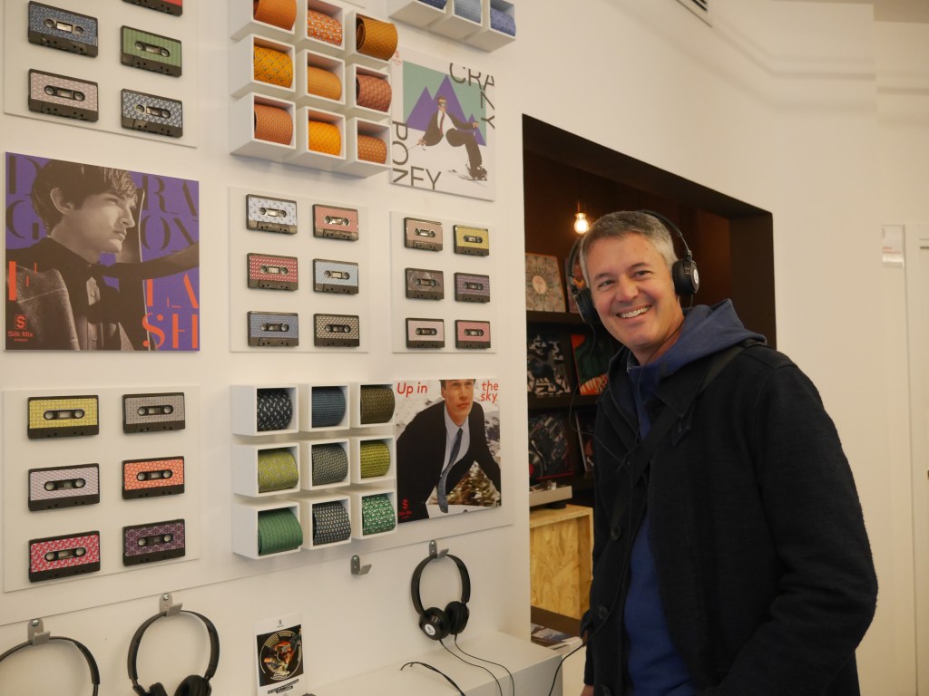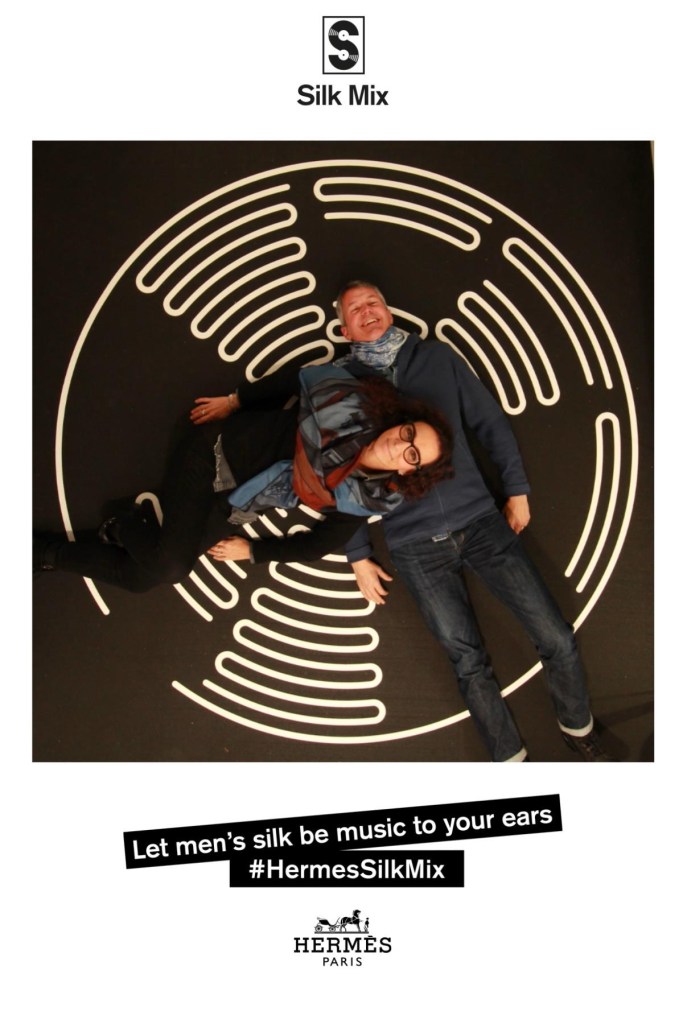 Nel negozio è possibile così ascoltare con le cuffie in una delle numerose postazioni i dischi con la musica che è stata utilizzata per le sfilate di presentazione di cravatte e carré. Nel sotterraneo ci si possono poi far prestare dei carré per farsi scattare foto ricordo sdraiati su un grande LP disegnato sul pavimento. Oltre alla stampa è possibile ricevere la foto in formato digitale via email (la foto è in fondo al pezzo: ok, io non sono venuto benissimo, ma per fortuna c’è Manuela).