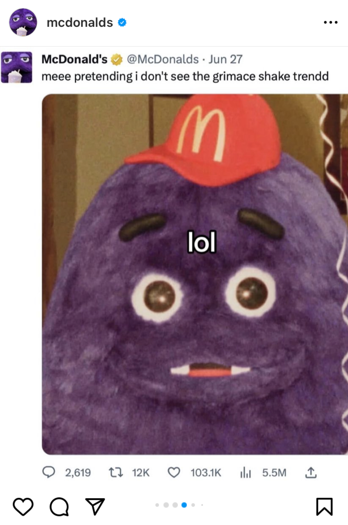 Quanto c’è stato di spontaneo e quanto di pilotato in questa challenge? Io penso che in questo caso abbia prevalso la spontaneità creativa degli utenti di TikTok, ma questo post di Grimace lascia che il dubbio continui ad aleggiare.